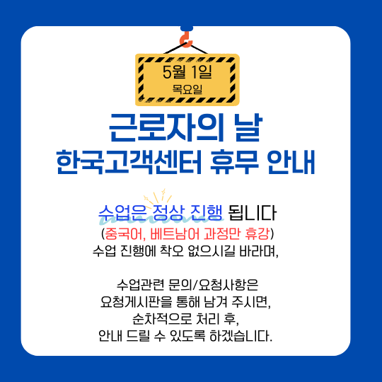 | 다음글 ▲ | 5/5(월)~5/6(화) 휴강 및 고객센터 휴무 안내 | 관리자 | 2025-04-30 | 3035 |