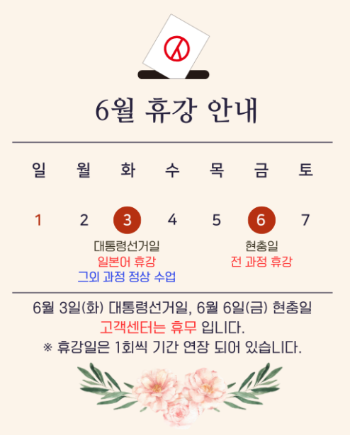 | 이전글 ▼ | 5/5(월)~5/6(화) 휴강 및 고객센터 휴무 안내 | 관리자 | 2025-04-30 | 3055 |