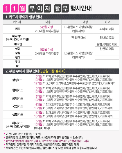 | 다음글 ▲ | 2015년 12월 무이자 할부 행사안내 | 관리자 | 2015-12-15 | 10496 |